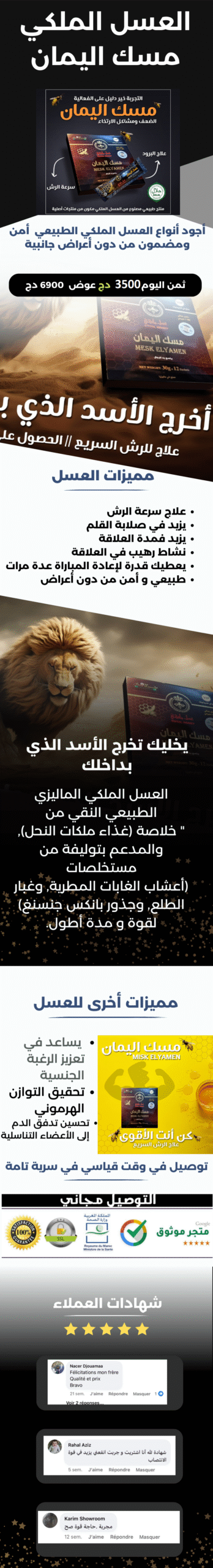 للطلب أضف معلوماتك في الأسفل 👇 اختر الولاية...01 Adrar - أدرار02 Chlef - الشلف03 Laghouat - الأغواط04 Oum El Bouaghi - أم البواقي05 Batna - باتنة06 Béjaïa - بجاية07 Biskra - بسكرة08 Bechar - بشار09 Blida - البليدة10 Bouira - البويرة11 Tamanrasset - تمنراست 12 Tébessa - تبسة 13 Tlemcene - تلمسان14 Tiaret - تيارت15 Tizi Ouzou - تيزي وزو16 Alger - الجزائر17 Djelfa - الجلفة18 Jijel - جيجل19 Sétif - سطيف20 Saïda - سعيدة21 Skikda - سكيكدة22 Sidi Bel Abbès - سيدي بلعباس23 Annaba - عنابة24 Guelma - قالمة25 Constantine - قسنطينة26 Médéa - المدية27 Mostaganem - مستغانم28 MSila - مسيلة29 Mascara - معسكر30 Ouargla - ورقلة31 Oran - وهران32 El Bayadh - البيض33 Illizi - إليزي 34 Bordj Bou Arreridj - برج بوعريريج35 Boumerdès - بومرداس36 El Tarf - الطارف37 Tindouf - تندوف38 Tissemsilt - تيسمسيلت39 Eloued - الوادي40 Khenchela - خنشلة41 Souk Ahras - سوق أهراس42 Tipaza - تيبازة43 Mila - ميلة44 Aïn Defla - عين الدفلى45 Naâma - النعامة46 Aïn Témouchent - عين تموشنت47 Ghardaïa - غرداية48 Relizane- غليزان49 Timimoun - تيميمون50 Bordj Baji Mokhtar - برج باجي مختار51 Ouled Djellal - أولاد جلال52 Béni Abbès - بني عباس53 Aïn Salah - عين صالح54 In Guezzam - عين قزام55 Touggourt - تقرت56 Djanet - جانت57 El MGhair - المغير58 El Menia - المنيعة اختر البلدية... - + اطلب الآن ملخص الطلب العسل الملكي مسك اليمان x1 د.ج3,500.00 سعر الشحن - السعر الإجمالي د.ج3,500.00